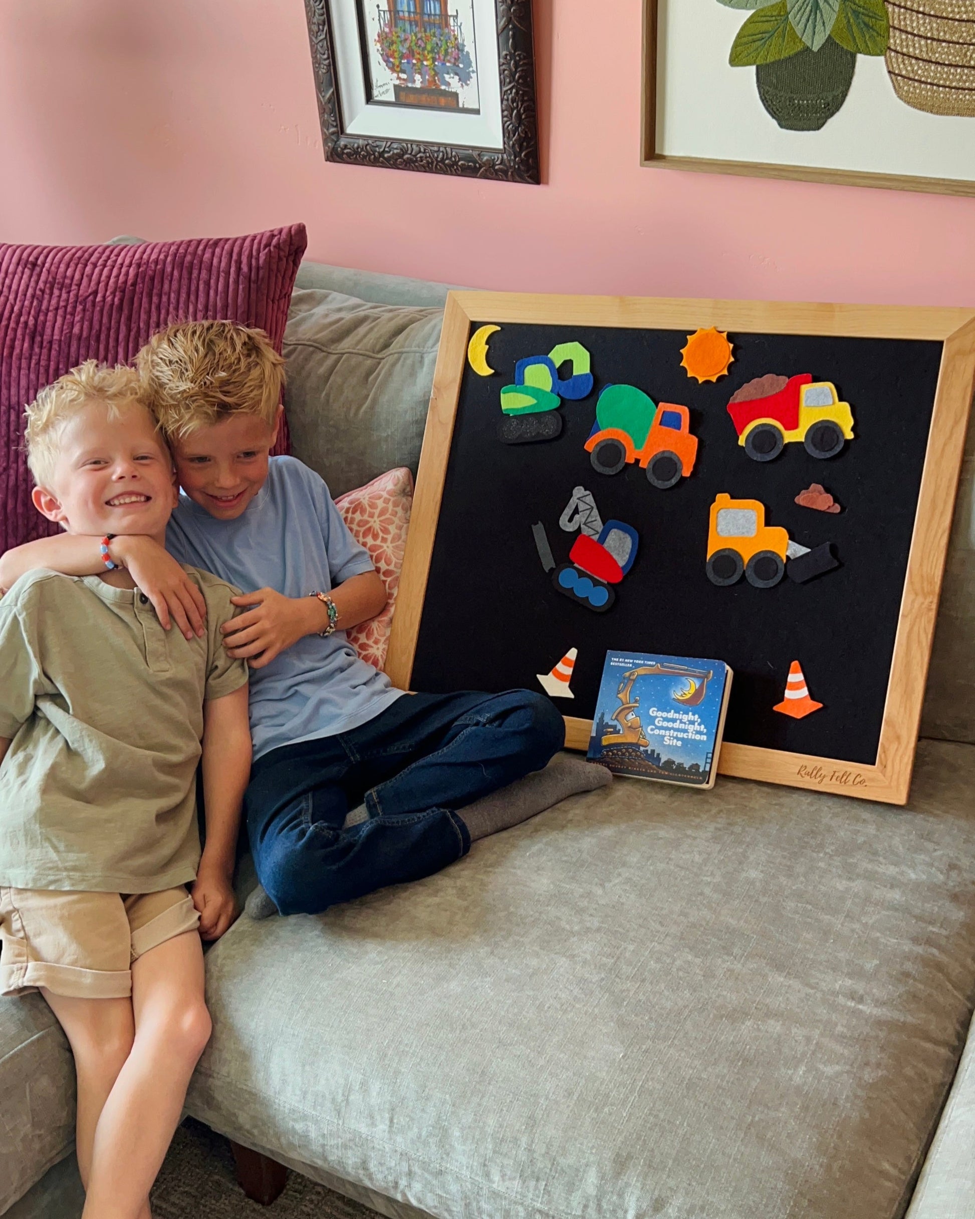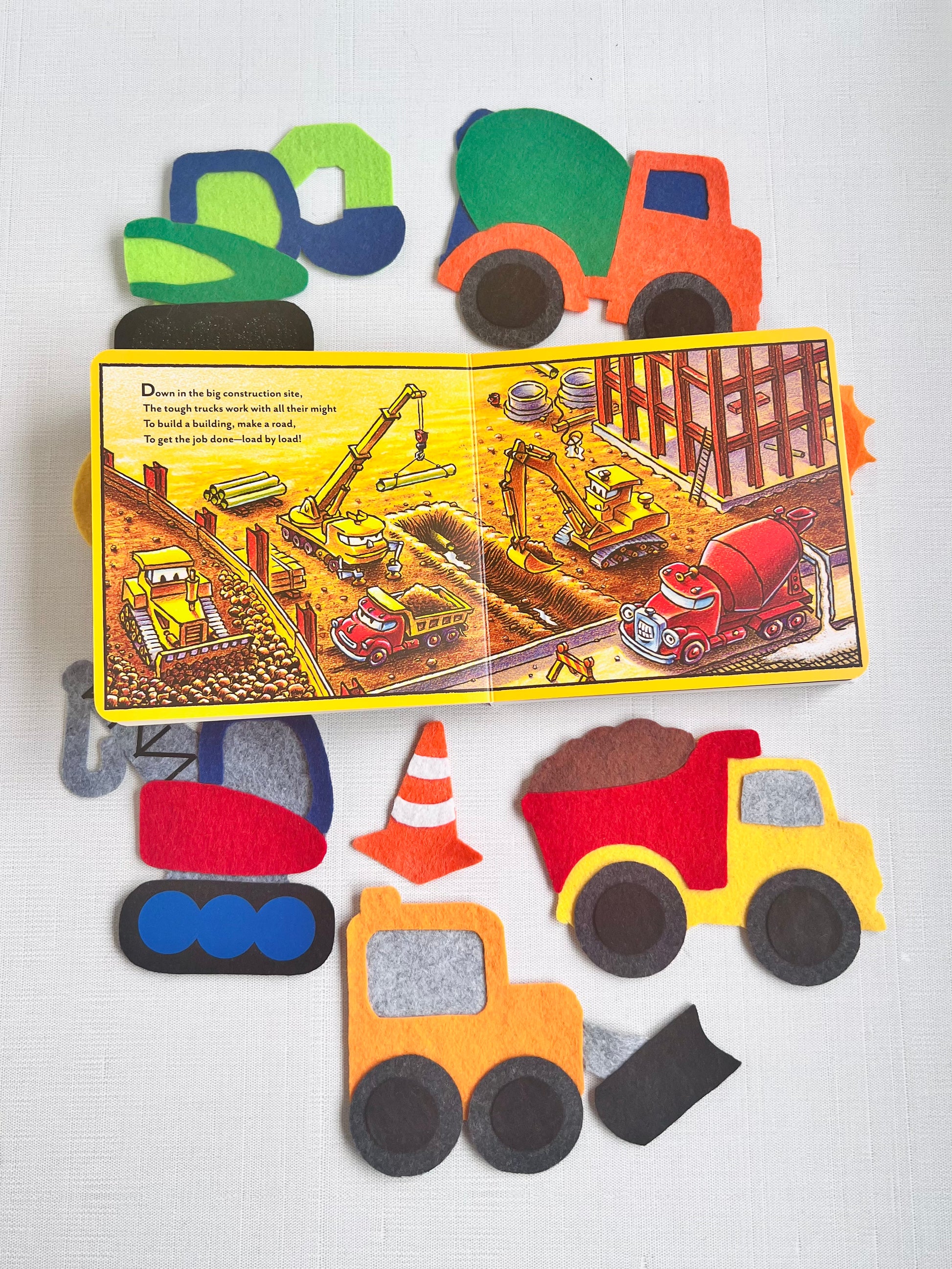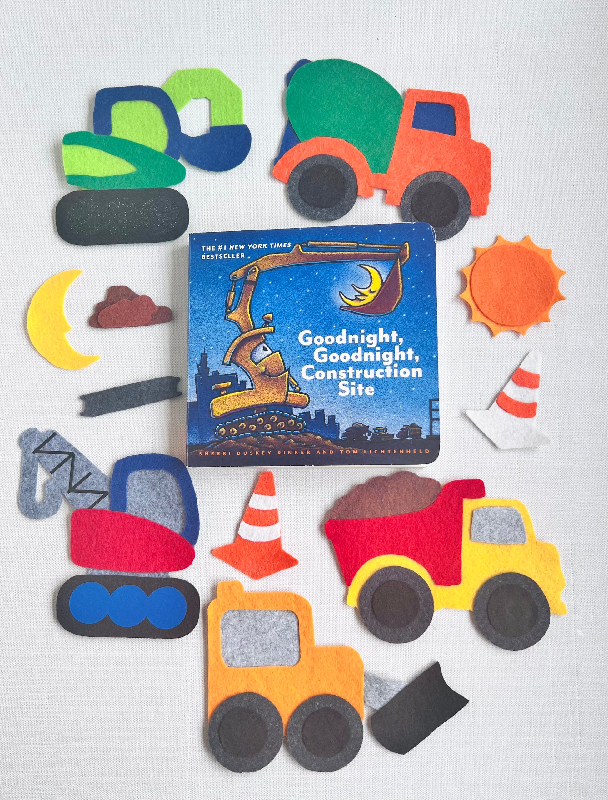 Bring Sherri Duskey Rinker’s Goodnight, Goodnight, Construction Site to life with this interactive felt set designed to turn storytime into a hands-on learning adventure. Featuring all your favorite hardworking vehicles—like the Excavator, Dump Truck, Cement Mixer, and more—this set encourages storytelling, sequencing, and sensory play that builds language and motor skills.